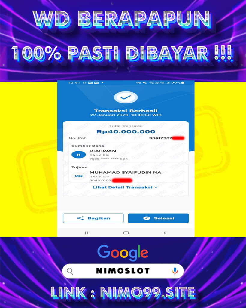 Kami NIMOSLOT sebagai situs resmi slot gacor online mudah menang maxwin hari ini, juga akan memberikan info bocoran game slot gacor untuk para member setia kami. Dan yang paling menarik lagi ialah anda dapat dengan mudah melakukan transaksi deposit maupun withdraw menggunakan beberapa cara. Yaitu transaksi dapat dengan menggunakan bank lokal, deposit pulsa, dan masih banyak yang lainnya.